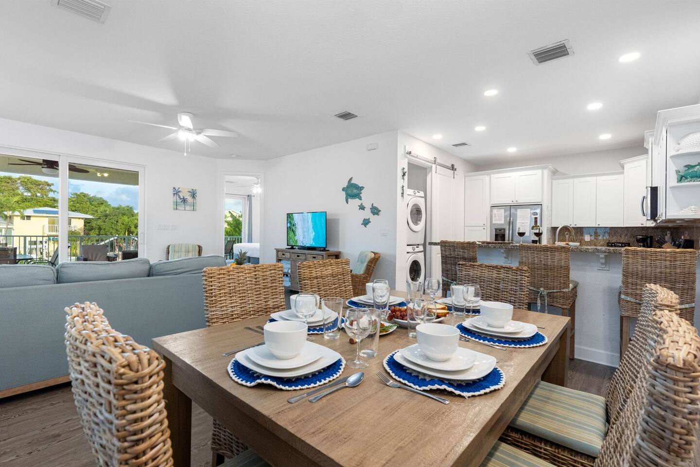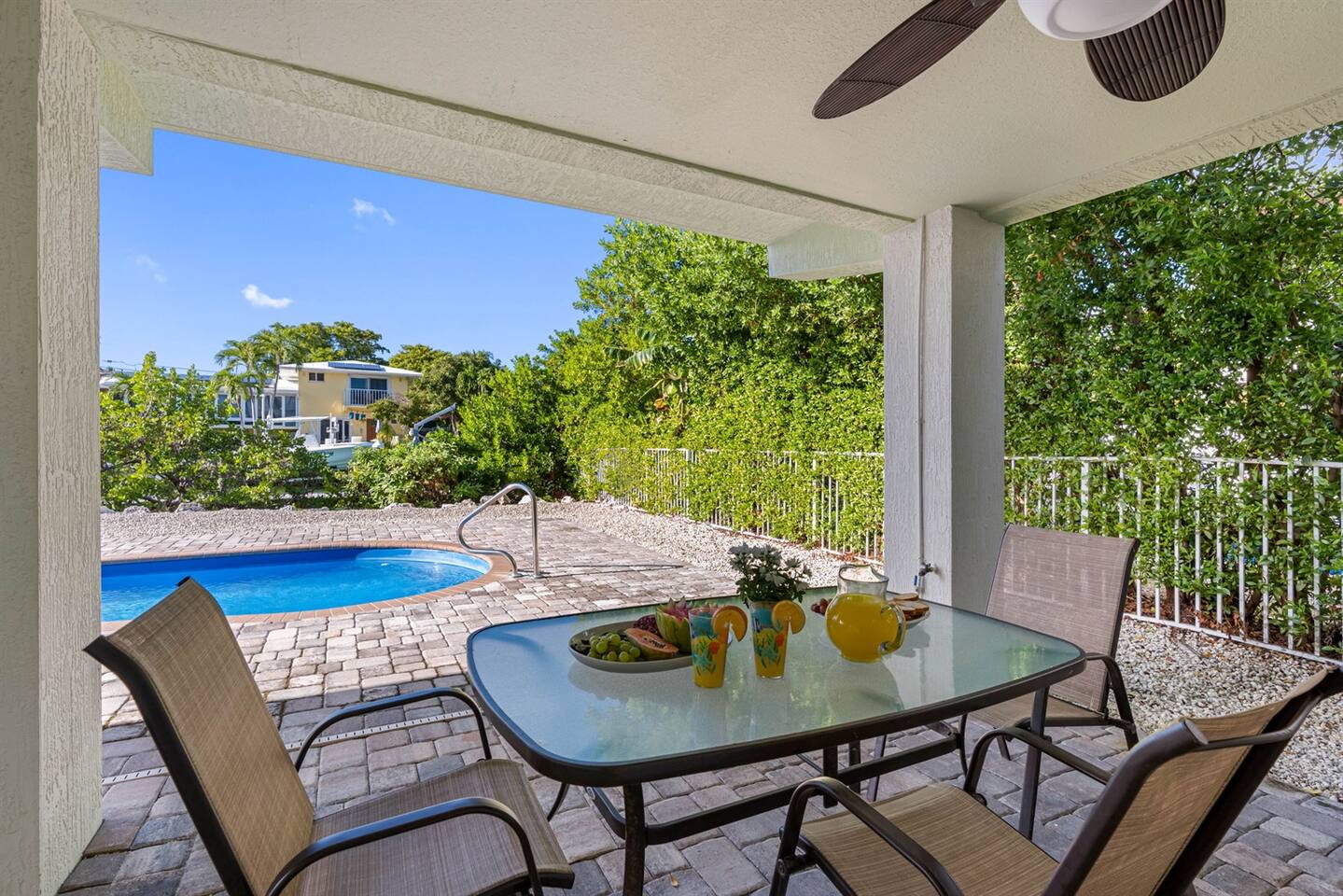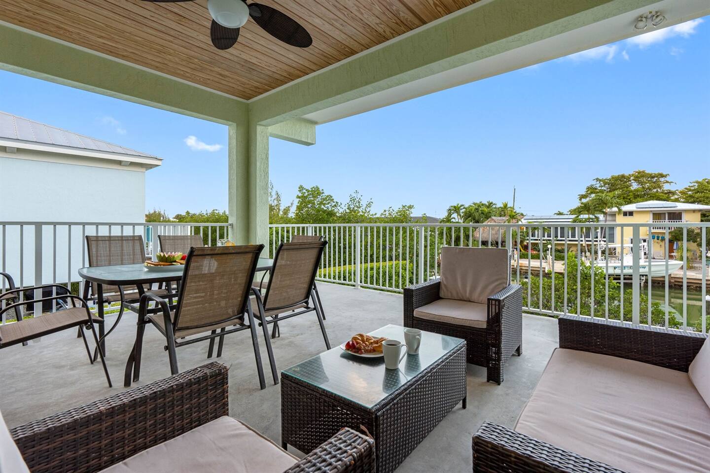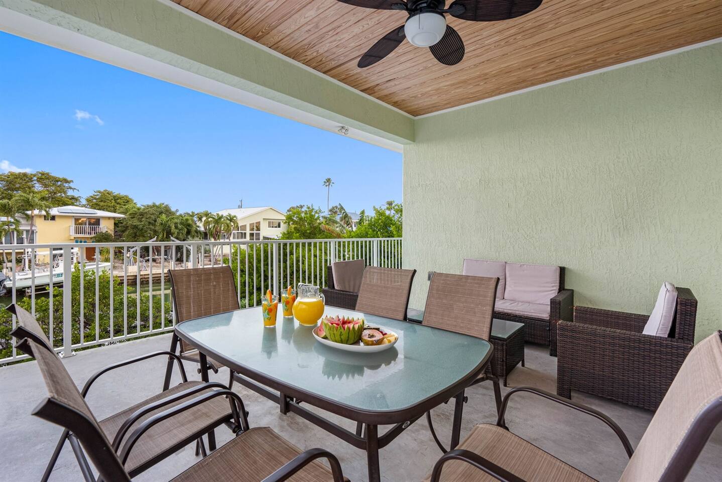 Living Area: Step into a warm and inviting living space featuring a comfortable and stylish sofa, perfect for relaxing with family or friends. The living area offers direct access to the balcony, where you can unwind while enjoying fresh air and serene views. Kitchen: The kitchen is fully equipped with modern appliances, including a refrigerator, stove, microwave, and dishwasher. It boasts sturdy white cupboards that offer plenty of storage space, making it a functional and convenient spot to prepare meals. Dining Area: Enjoy meals together in the dining area, which includes a spacious 6-seater dining table for formal gatherings. For casual dining, there’s a 3-seater dining counter that adds flexibility and style. Bedrooms: Bedroom 1: Features a luxurious king-size bed and an ensuite bathroom for added privacy and comfort. Bedroom 2: Furnished with a cozy queen-size bed, perfect for a restful night’s sleep. Bedroom 3: Offers another king-size bed, providing ample space and comfort. Bedroom 4: Comes with two twin beds and its own ensuite bathroom, ideal for guests or children. Bathrooms: Bathroom 1 (Ensuite to Bedroom 1): Includes a shower and toilet, offering convenience and privacy. Bathroom 2: Features a combination tub/shower and toilet, making it versatile for different preferences. Bathroom 3 (Ensuite to Bedroom 4): Equipped with a combination tub/shower and toilet, perfect for guests staying in Bedroom 4. Laundry Area: A dedicated laundry area is equipped with a complete washer and dryer set, making it easy to keep your clothes fresh during your stay. Outdoor Amenities: Pool: Relax and soak up the Florida sunshine by the beautiful outdoor pool. The pool area offers stunning views of the canal, creating a tranquil oasis. Private Dock: The property features a private dock where you can enjoy the peaceful surroundings and scenic views of the canal. It’s perfect for fishing, kayaking, or simply taking in the serene waterfront atmosphere. This property combines comfort, style, and convenience, making it an ideal choice for your stay. Whether you're enjoying the modern indoor amenities or the picturesque outdoor spaces, this home provides the perfect setting for relaxation and memorable moments.