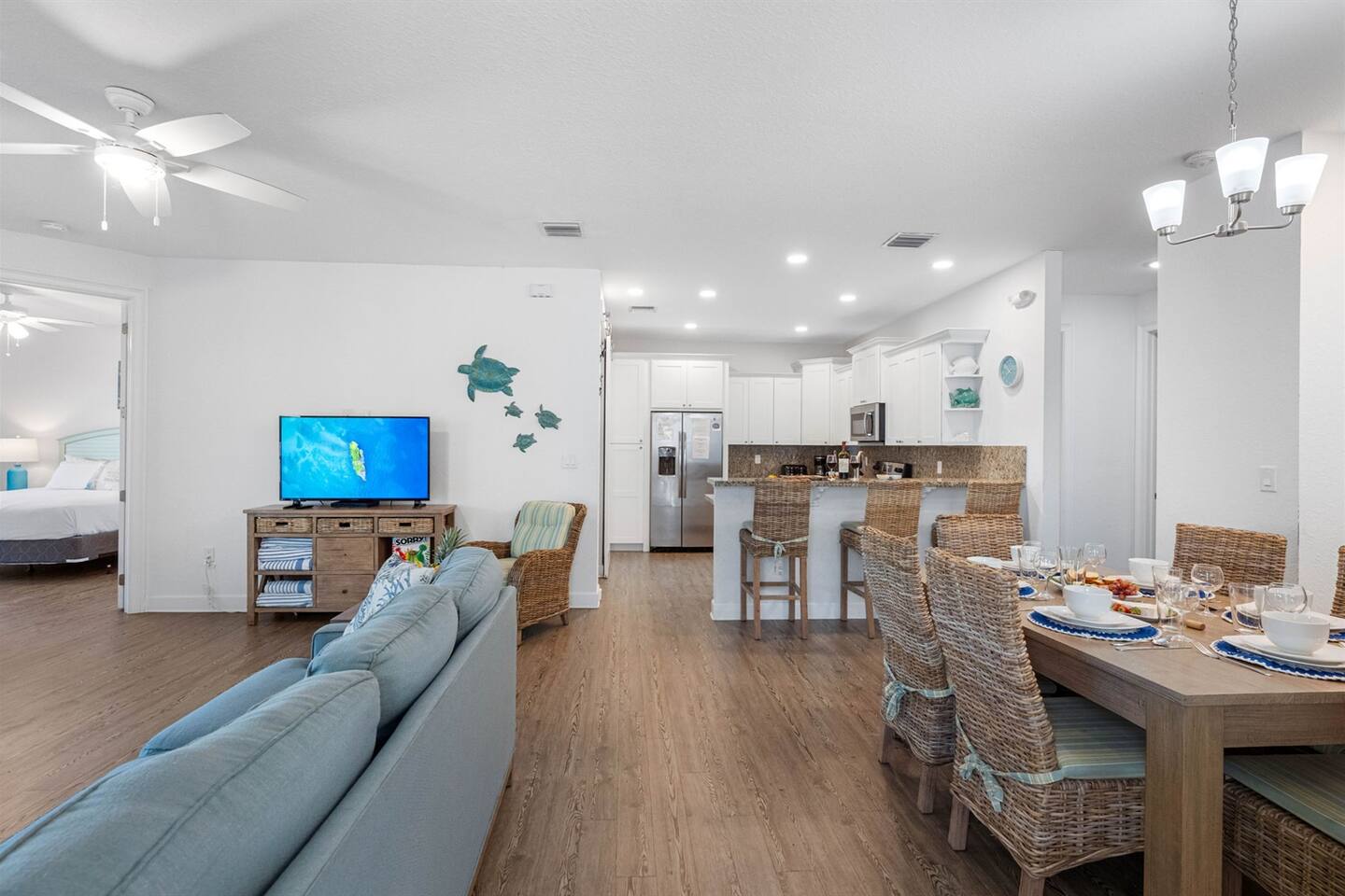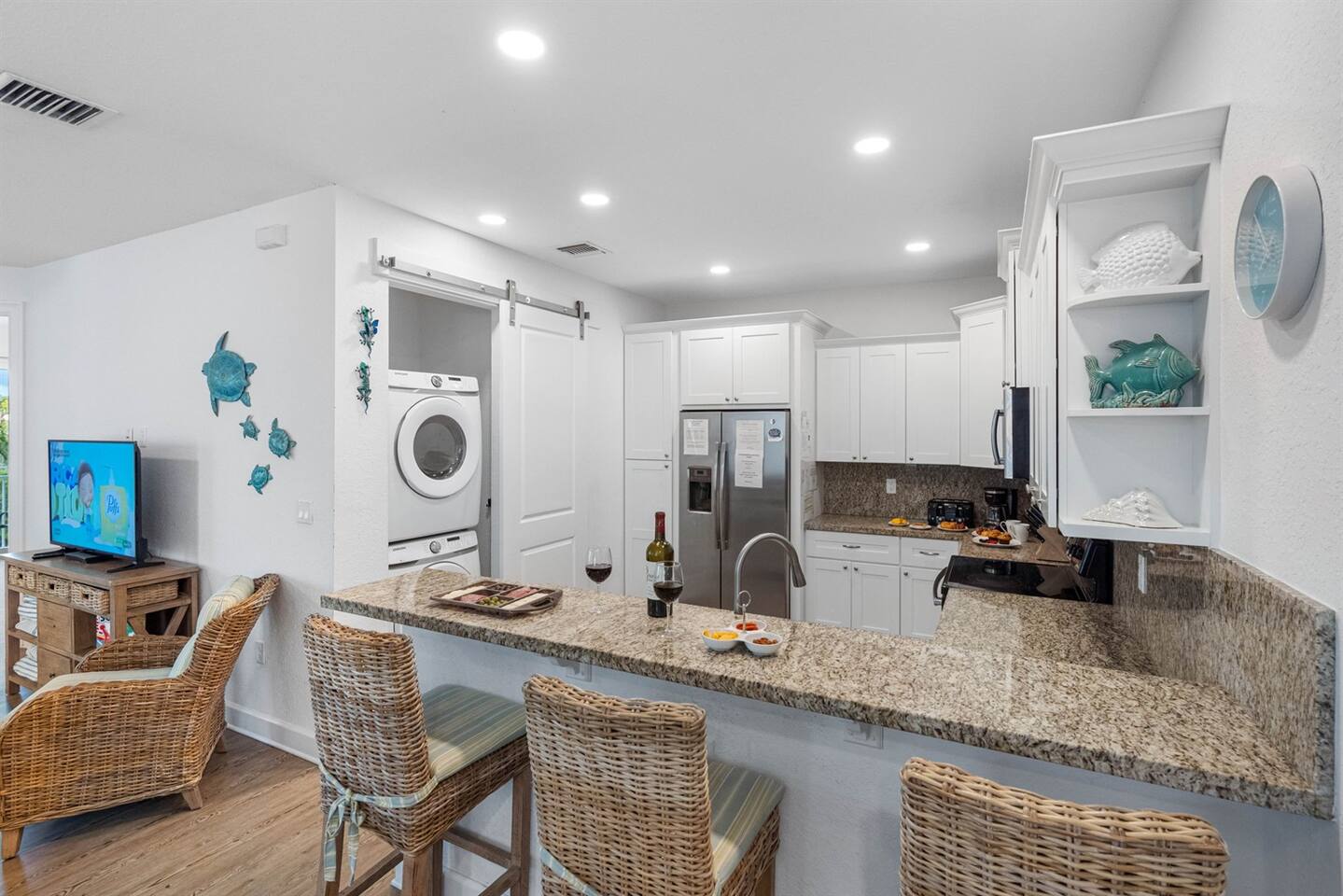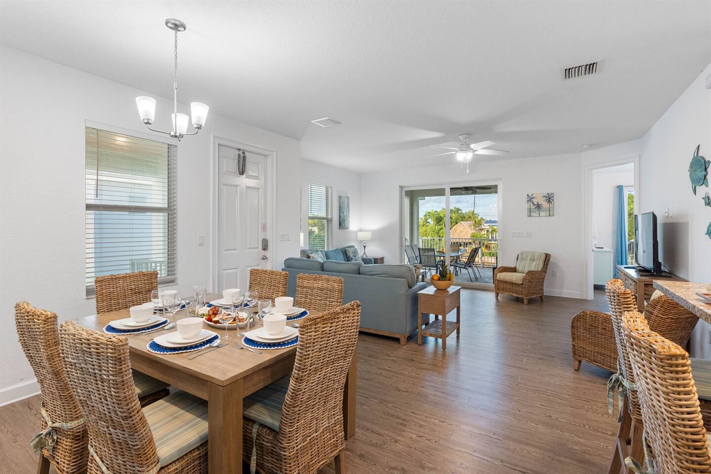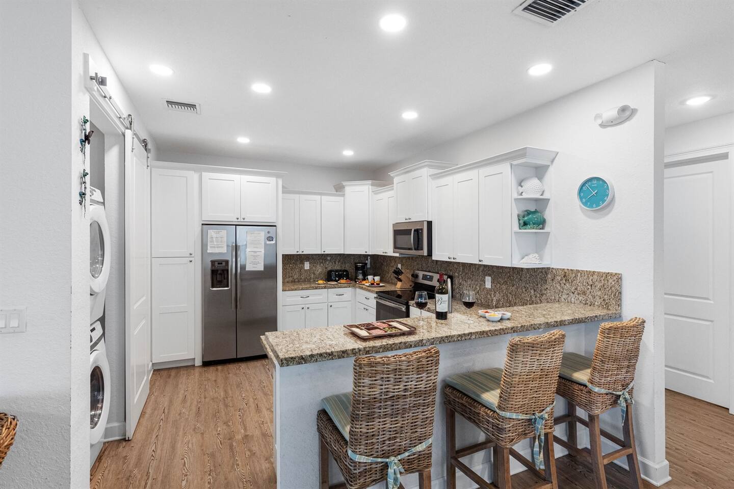 Living Area: Step into a warm and inviting living space featuring a comfortable and stylish sofa, perfect for relaxing with family or friends. The living area offers direct access to the balcony, where you can unwind while enjoying fresh air and serene views. Kitchen: The kitchen is fully equipped with modern appliances, including a refrigerator, stove, microwave, and dishwasher. It boasts sturdy white cupboards that offer plenty of storage space, making it a functional and convenient spot to prepare meals. Dining Area: Enjoy meals together in the dining area, which includes a spacious 6-seater dining table for formal gatherings. For casual dining, there’s a 3-seater dining counter that adds flexibility and style. Bedrooms: Bedroom 1: Features a luxurious king-size bed and an ensuite bathroom for added privacy and comfort. Bedroom 2: Furnished with a cozy queen-size bed, perfect for a restful night’s sleep. Bedroom 3: Offers another king-size bed, providing ample space and comfort. Bedroom 4: Comes with two twin beds and its own ensuite bathroom, ideal for guests or children. Bathrooms: Bathroom 1 (Ensuite to Bedroom 1): Includes a shower and toilet, offering convenience and privacy. Bathroom 2: Features a combination tub/shower and toilet, making it versatile for different preferences. Bathroom 3 (Ensuite to Bedroom 4): Equipped with a combination tub/shower and toilet, perfect for guests staying in Bedroom 4. Laundry Area: A dedicated laundry area is equipped with a complete washer and dryer set, making it easy to keep your clothes fresh during your stay. Outdoor Amenities: Pool: Relax and soak up the Florida sunshine by the beautiful outdoor pool. The pool area offers stunning views of the canal, creating a tranquil oasis. Private Dock: The property features a private dock where you can enjoy the peaceful surroundings and scenic views of the canal. It’s perfect for fishing, kayaking, or simply taking in the serene waterfront atmosphere. This property combines comfort, style, and convenience, making it an ideal choice for your stay. Whether you're enjoying the modern indoor amenities or the picturesque outdoor spaces, this home provides the perfect setting for relaxation and memorable moments.